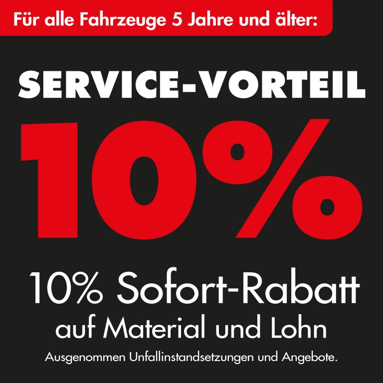 Nur bei uns und exklusiv für alle Fahrzeuge ab 5 Jahre und älter: 10% Sofort-Rabatt auf Material und Lohn.